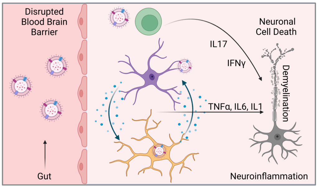 Multiple sclerosis (MS) is the most common chronic inflammatory autoimmune disease of the central nervous system (CNS) and starts in young individuals in the most productive period of their lives. Its multifactorial pathogenesis includes genetic and environmental factors such as communication of the gut microbiota with peripheral and central immune processes. Accordingly, previous studies have demonstrated that commensal microorganism in the gut can modulate immunological processes both in the peripheral immune system as well as within the CNS and alterations in gut microbial composition have been identified as essential component of neuroinflammation. In this context, published and preliminary data from our groups suggest that microbial derived factors participate in the onset and progression of autoimmune CNS inflammation in MS. However, our mechanistic understanding of these processes is still limited. Within this project, we will dissect microbiota-gut-brain communication via bacterial-derived extracellular vesicles and determine how this interaction affects the CNS and MS related autoimmunity. The long-term vision of this project is to identify novel routes of microbiota-brain crosstalk that can be targeted for therapeutic approaches.