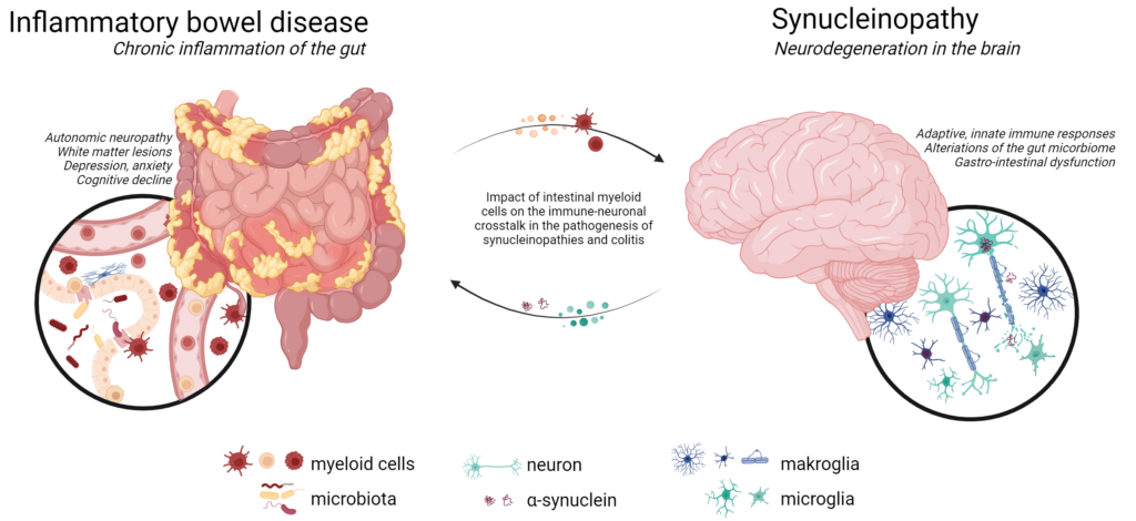 Inflammatory bowel disease (IBD) and chronic neurodegenerative diseases are epidemiologically linked, and unexpectedly share gene loci related to inflammatory processes. Neurodegenerative diseases, characterized by α-Synuclein (α-Syn) aggregation in the brain, and therefore termed synucleinopathies, display a progressive accumulation of complex neurologic symptoms but are also frequently associated with intestinal dysfunction. Conversely, neurologic symptoms (e.g. reduction of olfactory function, cognitive decline, increased anxiety, and depression) potentially caused by white matter lesions and autonomic neuropathy are often observed in inflammatory bowel disease (IBD) patients suffering from chronic intestinal inflammation of only partially understood etiology. These clinical data overall suggest that both diseases may have common, so far undiscovered pathomechanistic roots. In preliminary studies, we provide strong experimental evidence for the presence of a significant myeloid cell-derived signature in the brain during colitis while reciprocally, neurodegenerative disease states lead to pro-inflammatory imprinting of intestinal tissues. Overall, our data so far provide strong support for our hypothesis that myeloid lineage-derived cell populations – including brain-resident microglia, macrophages, inflammatory monocytes, and dendritic cells – may play an important role providing a pathomechanistic link between syncleinopathy and IBD. Hence, in our project, we seek to decipher the cellular and molecular impact of myeloid cell-driven immune signals from the gut to CNS-resident cells and vice versa in the context of synucleinopathies and IBD. Our long-term goal is to disentangle myeloid cell-dependent processes in order to identify and ideally functionally test novel therapeutic targets to prevent or at least limit disease-progressing inflammatory pathways in IBD and synucleinopathies.