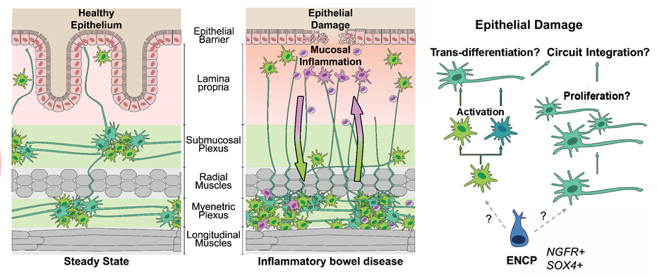 Patients with inflammatory bowel disease (IBD) are more frequently affected by neuropsychiatric, -degenerative and -immunological disorders. It is hypothesized that the co-morbidities of IBD with central nervous system (CNS) diseases reflect communication between the gut and the brain, but the mechanistic underpinnings of this communication remain largely unknown. The enteric nervous system (ENS) is anatomically and functionally connected to the gut and the brain and constitutes a candidate gateway for gut-brain communication. Our preliminary data demonstrate that intestinal inflammation is associated with pronounced ENS remodeling and increased innervation of the inflamed mucosa. Here we investigate the hypothesis that ENS homeostasis under steady-state and pathological conditions depends on the generation of new neurons and that disruption of ENS neurogenesis contributes to IBD and mediate pathological signals from the gut to the CNS. We will investigate this hypothesis through the in-depth histological, molecular and cell biological characterization of sophisticated transgenic mouse models in the context of different experimental IBD models. Results from this study are expected to uncover novel mechanisms on the role of the ENS in gut-brain communication.